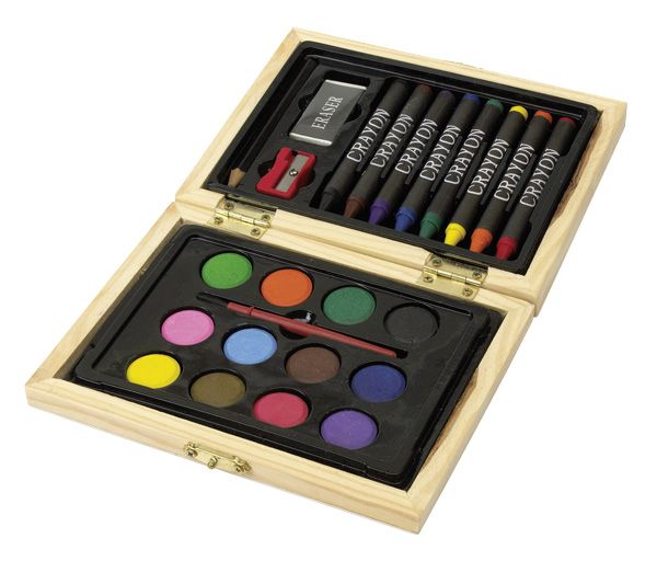 Malset "Creative Colour": bestehend aus 8 Wachsstiften, 12 Wassermalfarben und 1 Pinsel, 1 Bleistift, 1 Anspitzer und 1 Radiergummi; Im Holzkasten. Alle Preise zzgl. Kosten für die Werbeanbringung. Bei erwünschter Werbeanbringung auf dem bestellten Produkt, bitte einen Kommentar am Ende der Bestellung (Bestellschritt 5) abgeben. Wir setzen uns dann so schnell wie möglich mit Ihnen in Verbindung. Abnahme auch in geringeren Mengen möglich. Preise und Rabatte nach Absprache. Größe: 15,6 x 11,6 x 2,9cm |